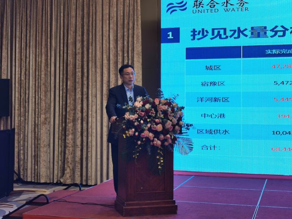 會議最后,聯合水務集團高級副總裁劉猛先生做重要講話。劉總裁一句 “宿遷的兄弟姐妹們,大家好”充分彰顯了聯合水務大家庭的溫暖。劉總裁用“四喜盈門”形容宿遷公司2019年所取得的優異成績。一喜是宿遷公司在巨大用水需求壓力下能夠保障全年安全供水;二喜是工程公司營收大大超額完成、團隊建設卓有成效、為集團內部工程無私奉獻的精神值得學習;三喜是耿車污水廠水量由量變到質變,有了質的飛躍,公司建設面貌突飛猛進;四喜是宿遷項目建設團隊為宿遷的供水事業發展所必需的供水基礎設施建設做出了優異的成績,可喜可賀。