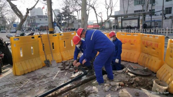公司管網部立即成立了臨時安裝小組,由部門經理帶隊,抽調精兵強將趕到現場勘察,設計施工方案,確定施工所需管材和配件并當即調配。施工現場厚厚的水泥路面為工程安裝帶來的不便,為了盡快完成安裝,公司外請了專業切割破碎隊負責道路切割,這樣雖然大大增加了施工成本,卻可以節省很多時間。施工現場熱火朝天,埋線、熱熔、對接、鋪設等各項工作有條不紊的進行著。施工人員帶著口罩,有些悶,不一會大家就面紅耳赤、汗流浹背,身在疫情防控隔離點,是離病毒危險最近的地方,可是大家絲毫顧不上個人安危,忘我地工作著,終于在下午17時完成了管道安裝,順利通水,從接到接水通知到通水僅用了3個小時,體現了聯合水務銀控供水人超強的組織能力和工作效率。