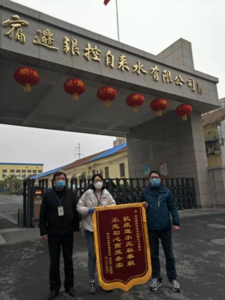 真情總能沖散疫情的陰霾,溫暖人間。2月11日下午,晴空萬里,暖陽高照,公司門口來了幾位特殊的訪客,他們手捧錦旗,錦旗上“抗疫送水無私奉獻、不忘初心高效務實”十六個燙金大字閃閃發光。送錦旗的正是宿城區人民醫院的工作人員,他們十分感謝公司迅速為其疫情防控隔離點安裝了自來水,為疫情防控工作的順利開展提供了強有力的保障。