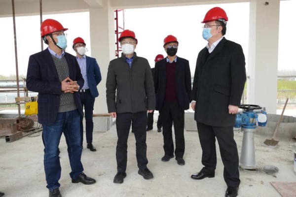 不顧舟車勞頓,俞總裁一行首先來到在建的第二水廠四期擴建工程現場。集團建設管理部副總經理葉峰向俞總一行介紹項目概況及進展情況。第二水廠四期擴建項目是在母公司聯合水務集團大力支持下,宿遷公司為適應宿遷市經濟社會的快速發展,未雨綢繆建設的工程,是宿遷市重點民生工程。該工程建設規模15萬噸/日,建設采用網格絮凝+平流沉淀池與清水池疊合工藝,使水處理構筑物結構更緊湊, 提升了土地使用率,凈水工藝采用先進的“臭氧+活性炭”的深度處理方式。該工程于2019年9月開工建設,今年7月高峰供水來臨前投入運行,屆時,宿遷項目公司的供水能力將達43萬噸/日,極大滿足城市發展供水需求。疫情給工程建設造成了一定的阻擾,但項目部在積極響應政府各項防控疫情政策前提下,千方百計克服困難,保證工程建設進度,目前各項施工及設備采購、安裝已逐漸步入正軌。俞總裁對四期擴建項目的設計規劃、土建施工、建設管理等給予了充分肯定,并提出了繼續努力,按期保質保量完成項目建設,為宿遷百姓安全供水做好保障的殷切期望。